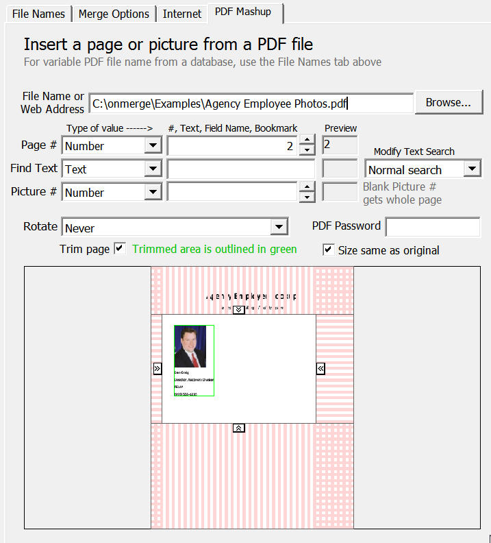 This section is about OnMerge PDFpasteup, an optional upgrade to classic OnMerge Images which is used to work with PDF files. You can upgrade classic versions of OnMerge Images to OnMerge PDFpasteup at http://OnMerge.com.