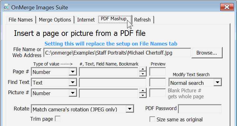 Copy or mail merge photos or entire pages from PDF files using the PDFpasteup feature of the OnMerge Images Suite.