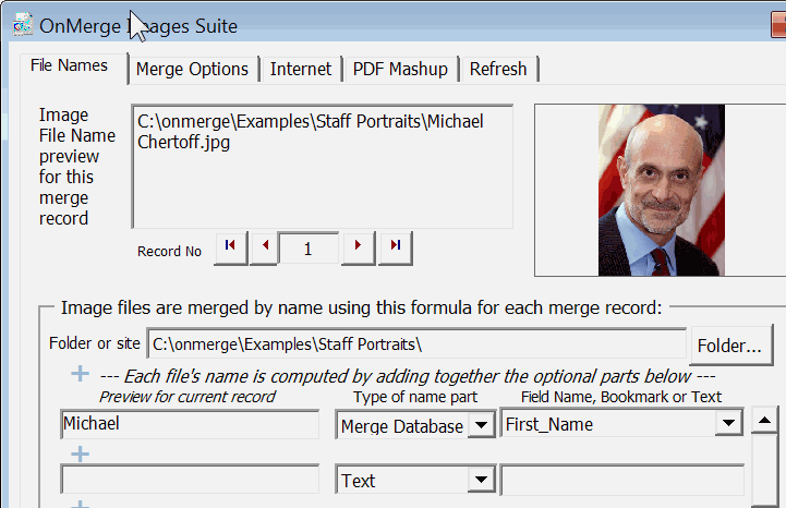 • compose an image file name from multiple database fields (such as FirstName + LastName)